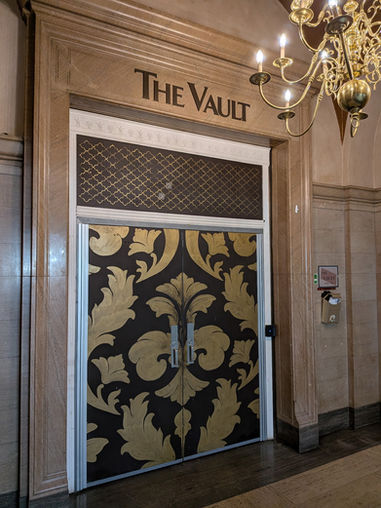 A historic bank vault in the ballroom that serves as a bar and a unique photo backdrop